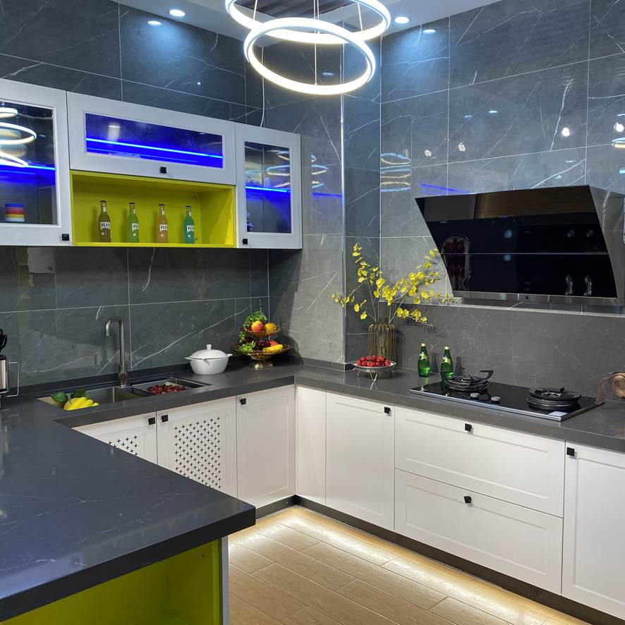不銹鋼櫥柜產品入其中,感覺渾然一體。為了防止堅硬材質的底柜、吊柜因為開合而發出噪音,櫥柜在這些地方會安裝消音條,使您享受到靜謐的料理時光。不銹鋼櫥柜可分可合,所有的部件都可以自由地安裝和組合,功能齊全。不銹鋼臺面外表很前衛,而且亮晶晶的不容易顯臟。即使沾染油污,也容易清理,使用多日還亮澤如新。夏天時觸感清涼,可以消除烹飪過程中帶來的熱熏焦躁之感。 截止2013年。所有可用于廚房臺面的材料中,不銹鋼的抗細菌再生能力排名**,所以在上面料理食物,應該是衛生不過了。